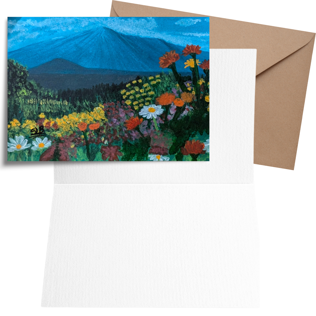 Experience our exclusive luxury collection of greeting cards – a breathtaking, vibrant, acrylic-painted masterpiece capturing a serene mountain landscape and lush valley full of flourishing wildflowers. The Artist was inspired by the stillness and serenity of Vibrant wildflowers with the beauty of Mt. Fuji as the back drop. Â This Card is blank, it contains no message inside so that you can include any message you like, making it quite versatile.