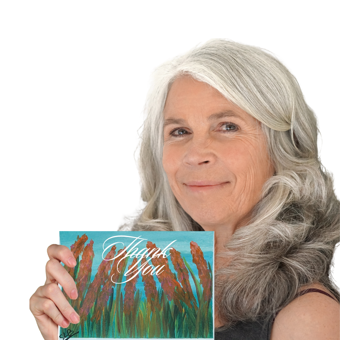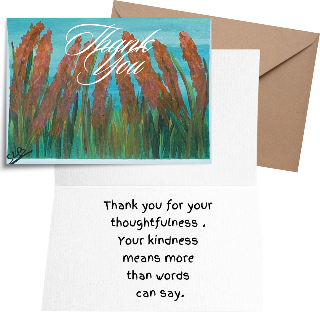 Experience our exclusive luxury collection of greeting cards – a breathtaking, vibrant, acrylic-painted masterpiece capturing red flowers in a field with blue sky back ground. The Artist was inspired by freshness of spring. Â This Thank You card contains just the right message in legible font size and style that looks like handwriting, that is clear and easy to read to ensure the message stands out beautifully. Â The message reads: Thank you for your thoughtfulness. Â Your kindness means more than words can say.