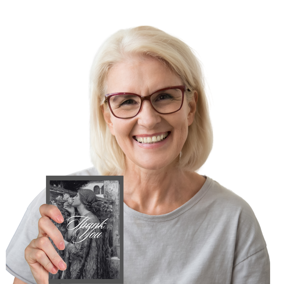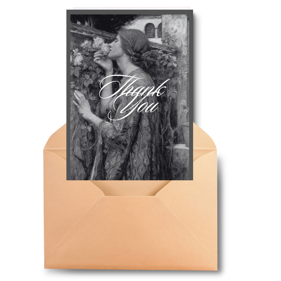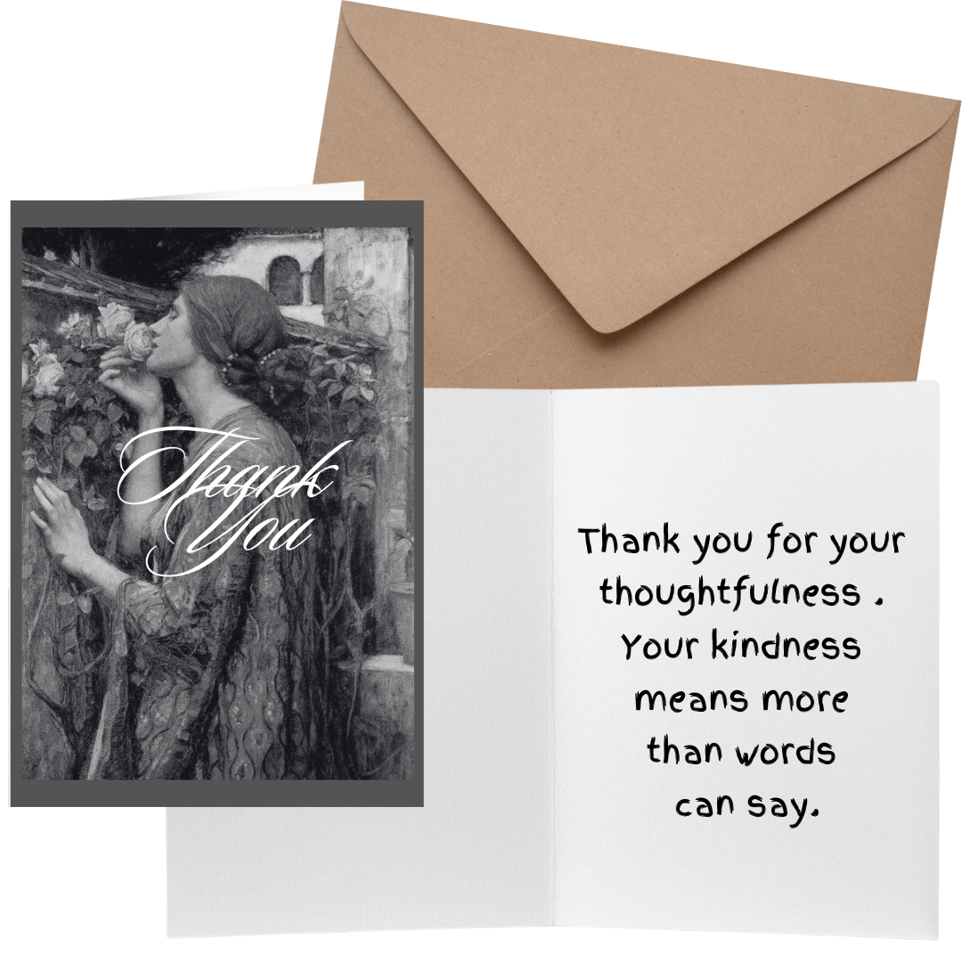 Experience our exclusive luxury collection of greeting cards – This greeting card contains vintage art called “Soul of a Rose” by John WilliamWaterhouse, 1908. It features a beautiful, ethereal woman standing against an outdoor backdrop, smelling a rose, which symbolizes longing for an invisible love. If you choose this black and white version of a Classic Painting you will bring home a piece of art history. This Thank You card contains just the right message in legible font size and style that looks like handwriting, that is clear and easy to read to ensure the message stands out beautifully. The message reads: Thank you for your thoughtfulness. Your kindness means more than words can say.