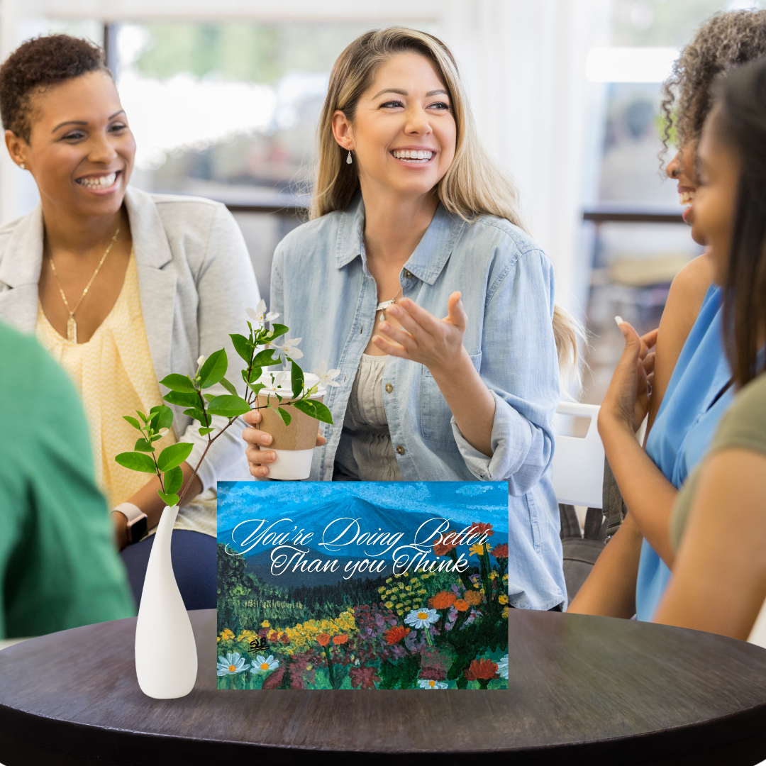 When it is difficult to put into words your feelings for a loved one who is a victim of or has survived abuse, this Mental Health Affirmation Card is here to help. It focuses on providing comfort, validation and hope without being dismissive or overly cheerful – everything your loved one needs to hear from you. Â On the front cover is a vivid Acrylic-painted landscape scene of serene mountain landscape with wildflowers. StephB4ever design was inspired by the stillness and serenity of Colorful wildflowers with the beauty of Mt. Fuji as the back drop. Â Inside is a clear and easy to read message that resembles a persons handwriting.