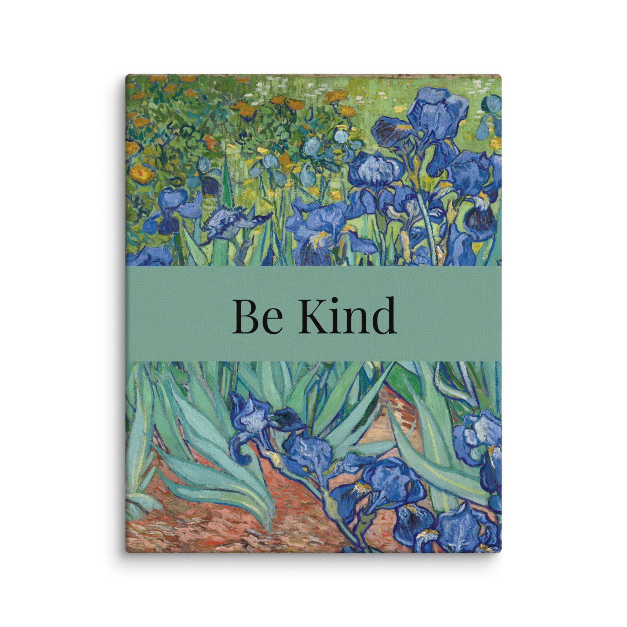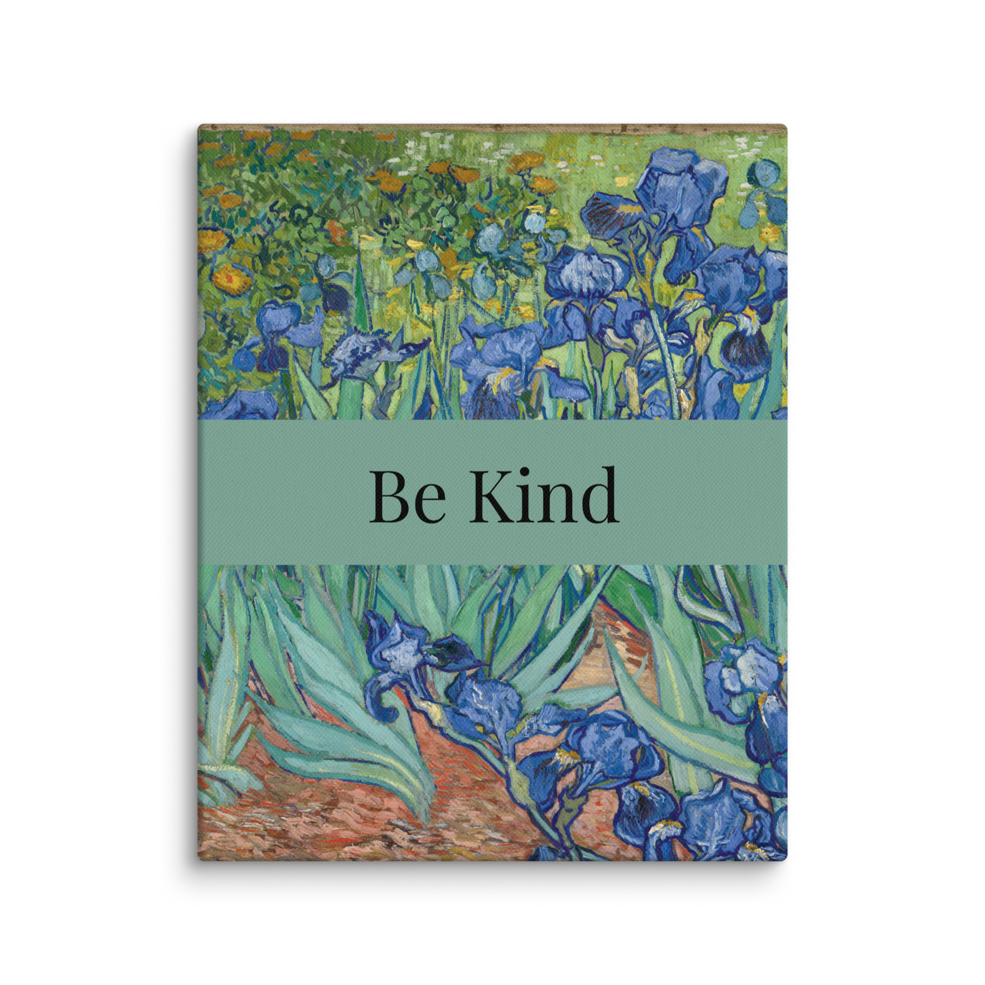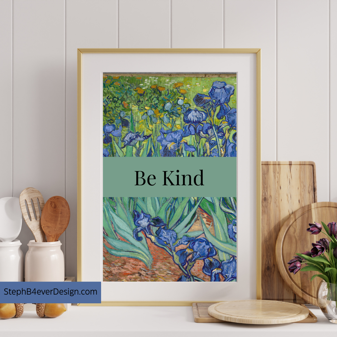 Welcome to StephB4ever Design. This is called “Irises” by Vincent Van Gogh, 1889, it includes a Motivational Quote – “Be Kind”. Stephb4ever Design was inspired by the scripture at 1 Corinthians 13:4 that shows how love behaves, it says “Love is patient and kind.” It is a good reminder in an unkind world. If you choose this Classic Painting you will bring home a piece of art history – add this to your cart today!!